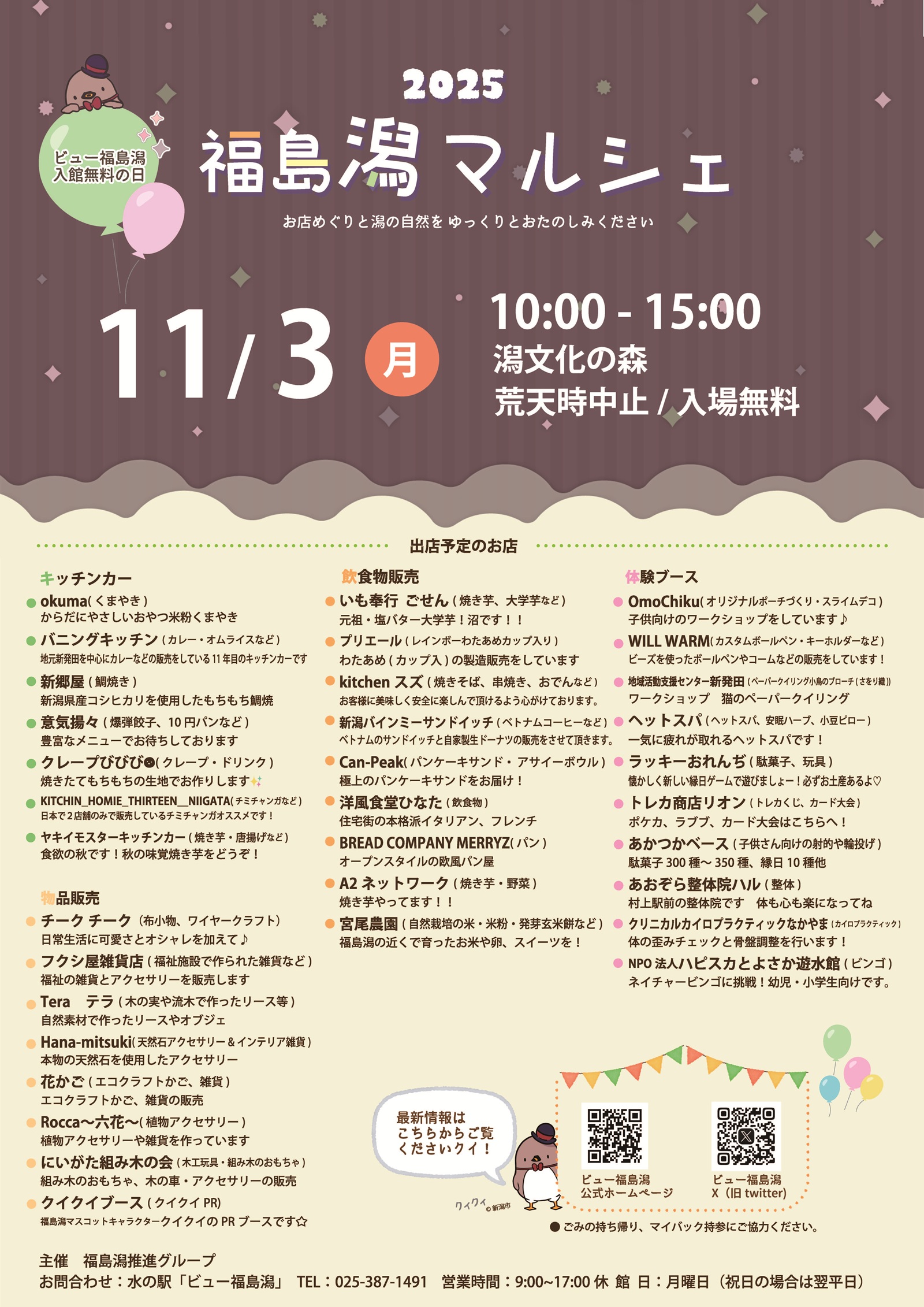2025年11月3日の福島潟マルシェは、雨天のためビュー福島潟館内での開催となりました。 11月3日は入館無料の日となっています。館内でごゆっくりお楽しみください。なお、出店内容には変更があります。詳細は当日ご確認ください。 (2025.11.2.更新)